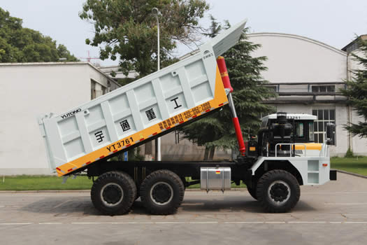 El ancho exterior del marco es de 1200 mm, y el lapso de las ruedas traseras es media y 2463mm. El vehículo minera YT3761 se presenta con gran rueda de envergadura, bajo centro de gravedad y alta estabilidad, que hacen que el camión volquete rígido más estable durante la conducción y más seguro mientras se trabaja en las zonas mineras.